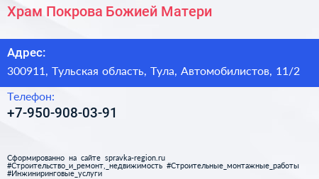 Храм Покрова Божией Матери по адресу 300911, Тульская область, Тула, Автомобилистов, 11/2 в дальнейшем Организация, размещена в следующих категориях: