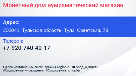 Монетный дом, нумизматический магазин по адресу 300041, Тульская область, Тула, Советская, 78 в дальнейшем Организация, размещена в следующих категориях: