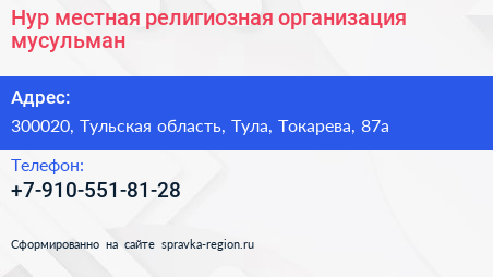 Нур, местная религиозная организация мусульман по адресу 300020, Тульская область, Тула, Токарева, 87а в дальнейшем Организация, размещена в следующих категориях: