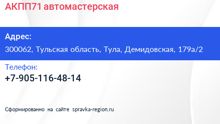 АКПП71, автомастерская по адресу 300062, Тульская область, Тула, Демидовская, 179а/2 в дальнейшем Организация, размещена в следующих категориях: