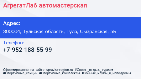 АгрегатЛаб, автомастерская по адресу 300004, Тульская область, Тула, Сызранская, 5Б в дальнейшем Организация, размещена в следующих категориях: