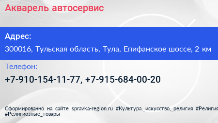 Акварель, автосервис по адресу 300016, Тульская область, Тула, Епифанское шоссе, 2 км в дальнейшем Организация, размещена в следующих категориях: