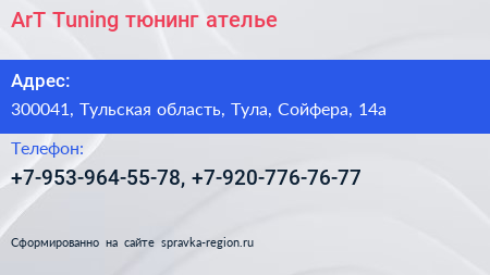 ArT Tuning, тюнинг ателье по адресу 300041, Тульская область, Тула, Сойфера, 14а в дальнейшем Организация, размещена в следующих категориях: