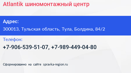 Atlantik, шиномонтажный центр по адресу 300013, Тульская область, Тула, Болдина, 84/2 в дальнейшем Организация, размещена в следующих категориях: