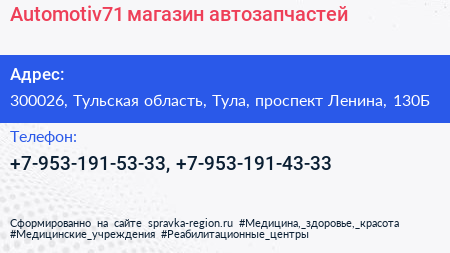 Automotiv71, магазин автозапчастей по адресу 300026, Тульская область, Тула, проспект Ленина, 130Б в дальнейшем Организация, размещена в следующих категориях: