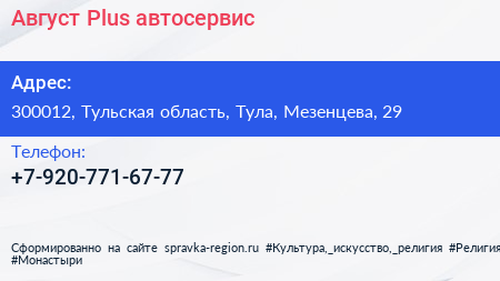 Август Plus, автосервис по адресу 300012, Тульская область, Тула, Мезенцева, 29 в дальнейшем Организация, размещена в следующих категориях: