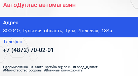 АвтоДуглас, автомагазин по адресу 300040, Тульская область, Тула, Ложевая, 134а в дальнейшем Организация, размещена в следующих категориях: