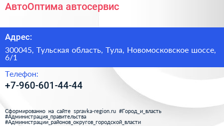 АвтоОптима, автосервис по адресу 300045, Тульская область, Тула, Новомосковское шоссе, 6/1 в дальнейшем Организация, размещена в следующих категориях: