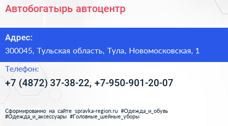 Автобогатырь, автоцентр по адресу 300045, Тульская область, Тула, Новомосковская, 1 в дальнейшем Организация, размещена в следующих категориях: