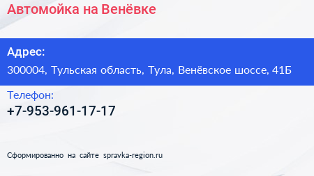 Автомойка на Венёвке по адресу 300004, Тульская область, Тула, Венёвское шоссе, 41Б в дальнейшем Организация, размещена в следующих категориях: