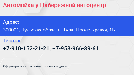 Автомойка у Набережной, автоцентр по адресу 300001, Тульская область, Тула, Пролетарская, 1Б в дальнейшем Организация, размещена в следующих категориях: