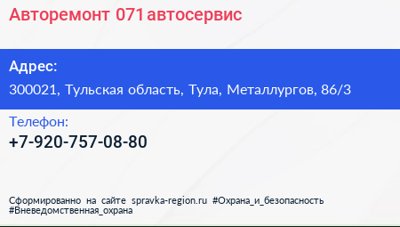 Авторемонт-071, автосервис по адресу 300021, Тульская область, Тула, Металлургов, 86/3 в дальнейшем Организация, размещена в следующих категориях: