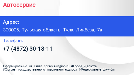 Автосервис по адресу 300005, Тульская область, Тула, Ликбеза, 7а в дальнейшем Организация, размещена в следующих категориях: