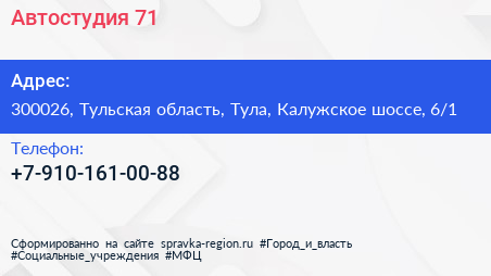 Автостудия 71 по адресу 300026, Тульская область, Тула, Калужское шоссе, 6/1 в дальнейшем Организация, размещена в следующих категориях:
