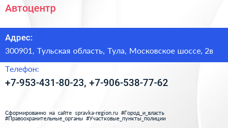Автоцентр по адресу 300901, Тульская область, Тула, Московское шоссе, 2в в дальнейшем Организация, размещена в следующих категориях: