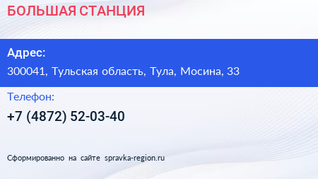 БОЛЬШАЯ СТАНЦИЯ по адресу 300041, Тульская область, Тула, Мосина, 33 в дальнейшем Организация, размещена в следующих категориях: