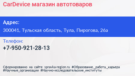 CarDevice, магазин автотоваров по адресу 300041, Тульская область, Тула, Пирогова, 26а в дальнейшем Организация, размещена в следующих категориях: