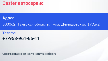 Caster, автосервис по адресу 300062, Тульская область, Тула, Демидовская, 179а/2 в дальнейшем Организация, размещена в следующих категориях:
