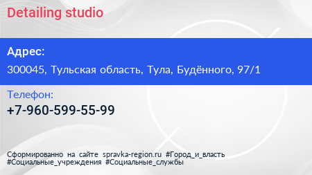 Detailing studio по адресу 300045, Тульская область, Тула, Будённого, 97/1 в дальнейшем Организация, размещена в следующих категориях: