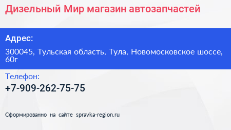 Дизельный Мир, магазин автозапчастей по адресу 300045, Тульская область, Тула, Новомосковское шоссе, 60г в дальнейшем Организация, размещена в следующих категориях: