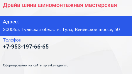 Драйв-шина, шиномонтажная мастерская по адресу 300065, Тульская область, Тула, Венёвское шоссе, 50 в дальнейшем Организация, размещена в следующих категориях: