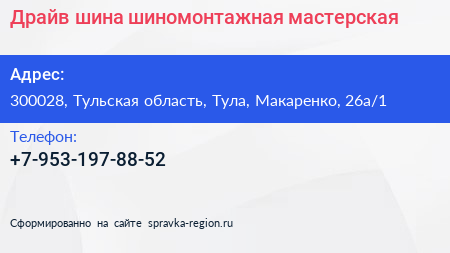 Драйв-шина, шиномонтажная мастерская по адресу 300028, Тульская область, Тула, Макаренко, 26а/1 в дальнейшем Организация, размещена в следующих категориях: