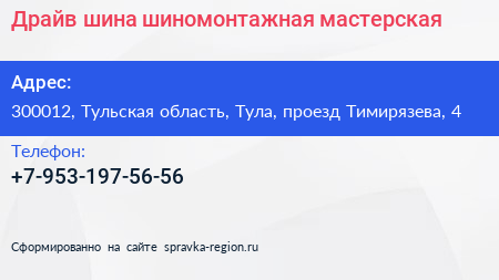 Драйв-шина, шиномонтажная мастерская по адресу 300012, Тульская область, Тула, проезд Тимирязева, 4 в дальнейшем Организация, размещена в следующих категориях: