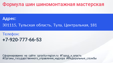 Формула шин, шиномонтажная мастерская по адресу 301115, Тульская область, Тула, Центральная, 181 в дальнейшем Организация, размещена в следующих категориях:
