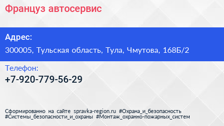 Француз, автосервис по адресу 300005, Тульская область, Тула, Чмутова, 168Б/2 в дальнейшем Организация, размещена в следующих категориях: