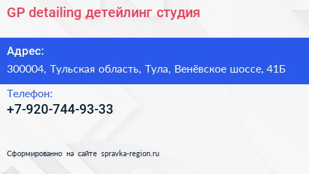 GP detailing, детейлинг-студия по адресу 300004, Тульская область, Тула, Венёвское шоссе, 41Б в дальнейшем Организация, размещена в следующих категориях: