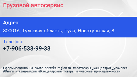 Грузовой автосервис по адресу 300016, Тульская область, Тула, Новотульская, 8 в дальнейшем Организация, размещена в следующих категориях: