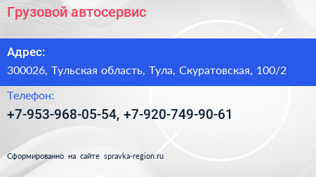 Грузовой автосервис по адресу 300026, Тульская область, Тула, Скуратовская, 100/2 в дальнейшем Организация, размещена в следующих категориях: