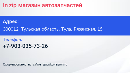 In zip, магазин автозапчастей по адресу 300012, Тульская область, Тула, Рязанская, 15 в дальнейшем Организация, размещена в следующих категориях: