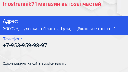 Inostrannik71, магазин автозапчастей по адресу 300026, Тульская область, Тула, Щёкинское шоссе, 1 в дальнейшем Организация, размещена в следующих категориях: