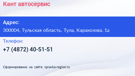 Кант, автосервис по адресу 300004, Тульская область, Тула, Каракозова, 1а в дальнейшем Организация, размещена в следующих категориях: