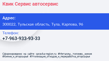 Квик Сервис, автосервис по адресу 300022, Тульская область, Тула, Карпова, 96 в дальнейшем Организация, размещена в следующих категориях: