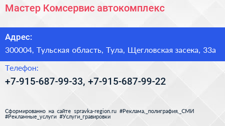 Мастер Комсервис, автокомплекс по адресу 300004, Тульская область, Тула, Щегловская засека, 33а в дальнейшем Организация, размещена в следующих категориях: