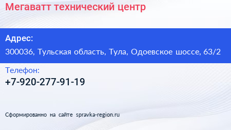 Мегаватт, технический центр по адресу 300036, Тульская область, Тула, Одоевское шоссе, 63/2 в дальнейшем Организация, размещена в следующих категориях: