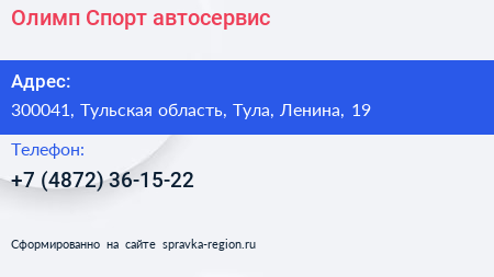 Олимп-Спорт, автосервис по адресу 300041, Тульская область, Тула, Ленина, 19 в дальнейшем Организация, размещена в следующих категориях: