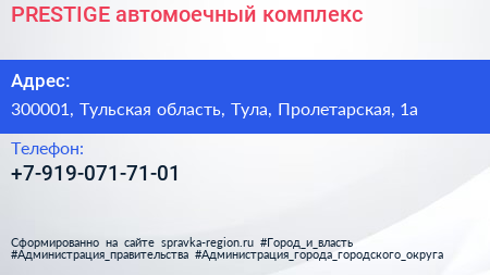 PRESTIGE, автомоечный комплекс по адресу 300001, Тульская область, Тула, Пролетарская, 1а в дальнейшем Организация, размещена в следующих категориях: