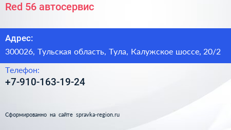 Red 56, автосервис по адресу 300026, Тульская область, Тула, Калужское шоссе, 20/2 в дальнейшем Организация, размещена в следующих категориях: