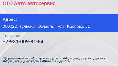 СТО Авто, автосервис по адресу 300022, Тульская область, Тула, Карпова, 51 в дальнейшем Организация, размещена в следующих категориях: