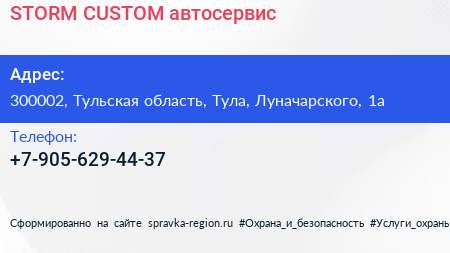 STORM CUSTOM, автосервис по адресу 300002, Тульская область, Тула, Луначарского, 1а в дальнейшем Организация, размещена в следующих категориях: