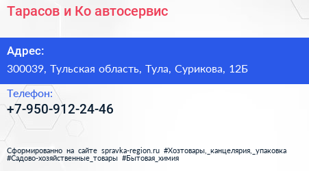 Тарасов и Ко, автосервис по адресу 300039, Тульская область, Тула, Сурикова, 12Б в дальнейшем Организация, размещена в следующих категориях: