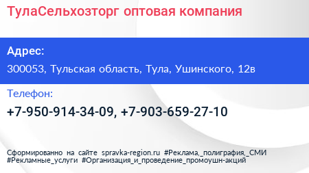 ТулаСельхозторг, оптовая компания по адресу 300053, Тульская область, Тула, Ушинского, 12в в дальнейшем Организация, размещена в следующих категориях: