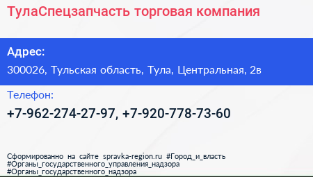 ТулаСпецзапчасть, торговая компания по адресу 300026, Тульская область, Тула, Центральная, 2в в дальнейшем Организация, размещена в следующих категориях: