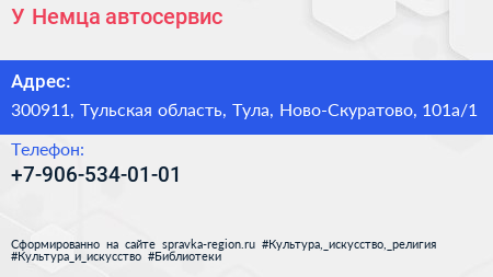 У Немца, автосервис по адресу 300911, Тульская область, Тула, Ново-Скуратово, 101а/1 в дальнейшем Организация, размещена в следующих категориях: