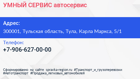 УМНЫЙ СЕРВИС, автосервис по адресу 300001, Тульская область, Тула, Карла Маркса, 5/1 в дальнейшем Организация, размещена в следующих категориях: