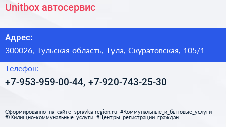 Unitbox, автосервис по адресу 300026, Тульская область, Тула, Скуратовская, 105/1 в дальнейшем Организация, размещена в следующих категориях: