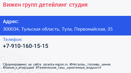 Вижен групп, детейлинг-студия по адресу 300034, Тульская область, Тула, Первомайская, 35 в дальнейшем Организация, размещена в следующих категориях: